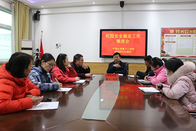 3月16日下午,市十二中校园安全稳定工作推进会议在三楼会议室召开,校长范登河主持会议,校班子成员、中层干部和相关工作人员参加。