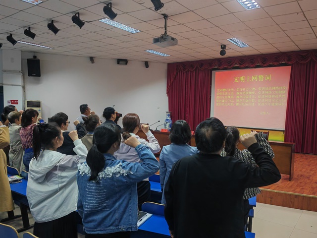 全体教工会上,副校长郭军带领大家学习了《中华人民共和国网络安全法》等互联网法律规定,进一步增强教职工的网络安全防范意识及文明上网意识。校长范登河强调,每一位老师要严格遵守互联网法律法规,增强法律意识、道德意识,加强自我学习,自我约束,不轻信、不盲从,积极践行文明上网。全体教师集体宣誓,共同维护清朗网络空间,传递上网正能量,争做新时代好网民。
