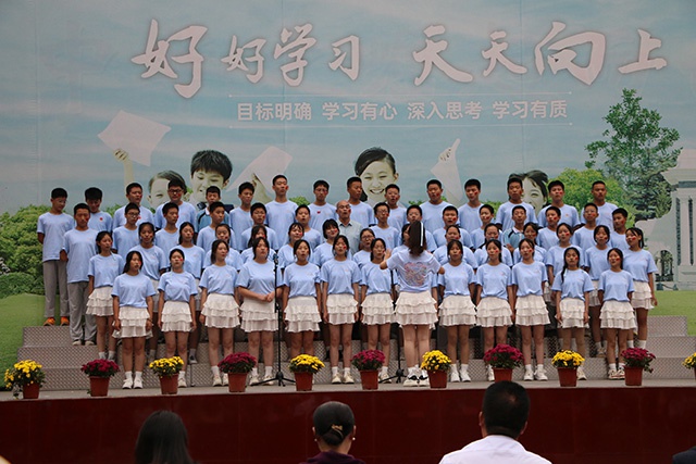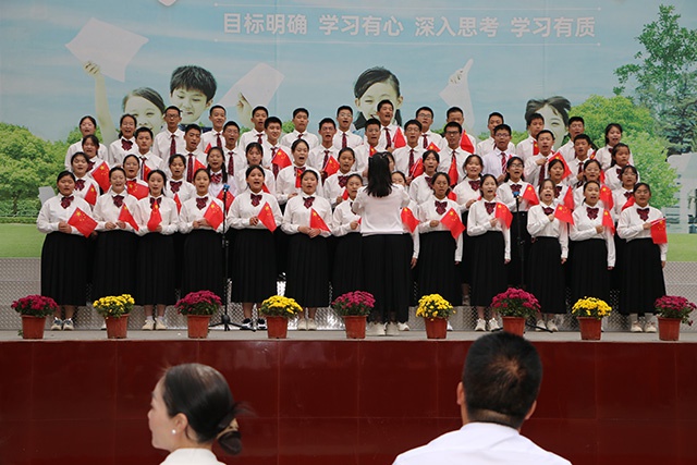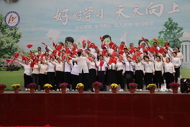 最后,全体教师合唱的《大中国》更是把现场气氛推向了高潮。台上台下共歌唱,老师学生同抒怀,大家把对祖国母亲的热爱、对远大理想的追求、对美好生活的向往都融进了美妙的歌声之中,都融入到了挥动的国旗之中。