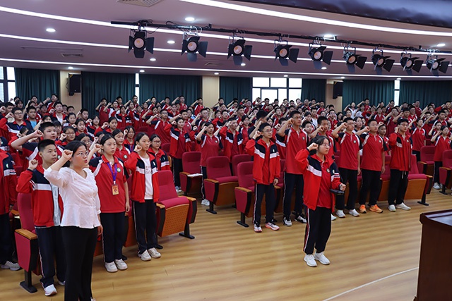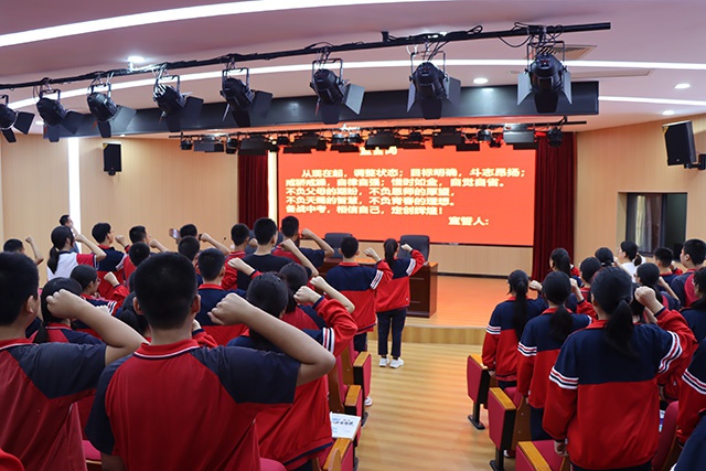 全体九年级同学在领誓人王晨伊同学的带领下,举起右拳,齐声宣誓:“面对中考,我们不畏艰难;目标明确,斗志昂扬;戒骄戒躁,自律自强 ......!”誓言铿锵有力,表达了全体九年级学生的决心,他们将以拼搏之姿迎接挑战,为梦想全力以赴。