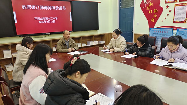 为进一步加强师德师风建设,不断增强教师法纪意识,严明底线红线,切实规范教师职业道德行为,着力打造德才兼备的高素质教师队伍,2025年2月11日,平顶山市第十二中学组织全体教师开展了师德师风专题学习培训活动并签订师德师风承诺书。