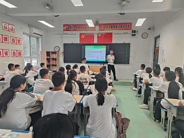 副校长郭军以“常怀感恩,方明事理;心系国家,可成人才”为主题,为新生们带来一堂意义深远的思政课。他从爱国家、爱学校两个维度出发,鼓励同学们在新起点树立远大理想,以不懈奋斗践行“有理想、有本领、有担当”的新时代少年使命,让红色基因与校园文化在课堂中深度融合。
