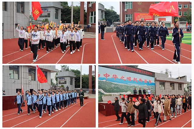 伴着激昂的运动员进行曲,入场仪式正式开启。国旗队率先登场,队员们迈着铿锵步伐擎旗前行,鲜红国旗在阳光下熠熠生辉;校旗队紧随其后,承载着学校精神的校旗醒目昂扬;彩旗队手持彩绸舞动,红、黄、蓝、绿交织成流动的画卷,为赛场增添激昂氛围。