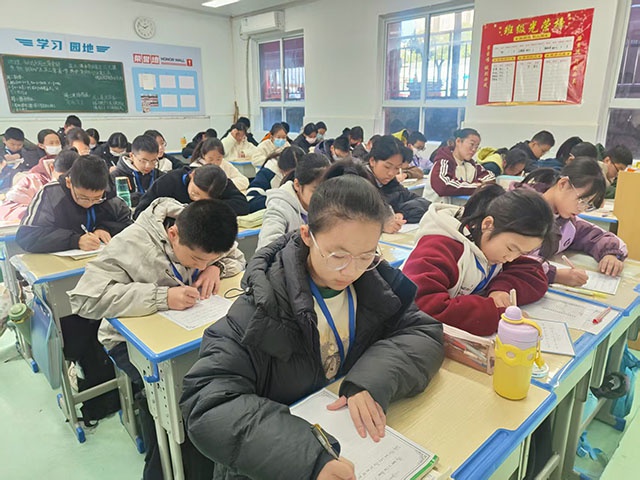 本次比赛面向全体七年级学生,一经启动便得到同学们的踊跃响应与热情参与。赛场之上,学子们身姿挺拔、握笔有度,凝神专注于纸面之间。笔尖流转处,一个个字母圆润隽秀,一组组单词间距匀称,一行行句子流畅自然,墨痕里藏着严谨细致的态度。现场唯有沙沙笔声,却满溢着专注求索的氛围,成为校园中一道静谧而动人的风景线。