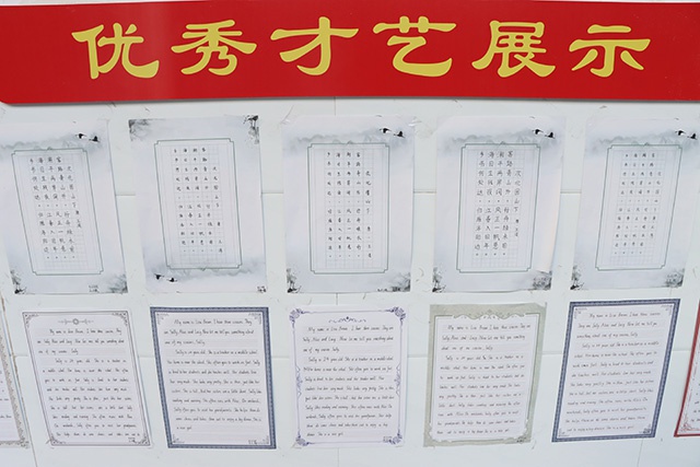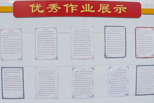 展示墙清晰划分两大核心板块,内容丰富而富有特色。在 “优秀才艺展示” 板块,整齐陈列的硬笔书法作品尤为亮眼,内容涵盖经典诗词片段,笔锋遒劲工整、布局疏密匀称,尽显同学们扎实的文字功底;英文书写作品字迹娟秀流畅,搭配创意十足的边框设计,既展现了英语学科素养,更彰显了同学们的巧思妙想。另一板块 “优秀作业展示” 中,各科优秀作业字迹工整、细节完善,直观呈现了七年级学子严谨认真的学习态度与良好的学习习惯。