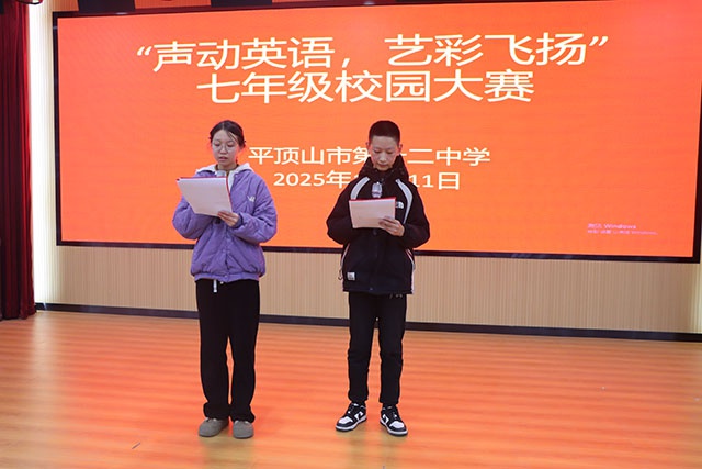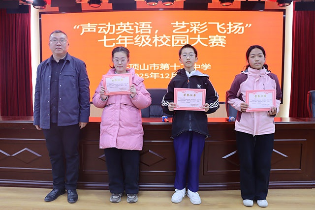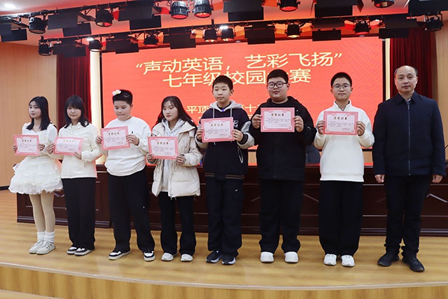 为丰富的校园文化生活,提升学生英语综合素养,2025年12月11日,我校七年级举办的“声动英语,艺彩飞扬”英语展风采大赛在校五楼报告厅圆满落幕。校长李海涛、副校长王苹苹受邀出席。