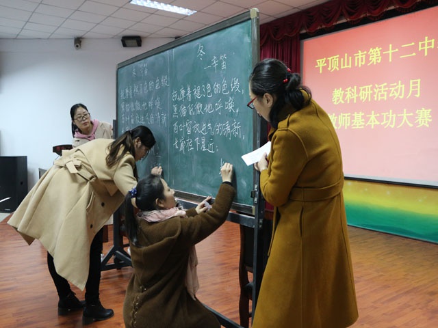 本次大赛旨在推动学校青年教师教学基本能力提高,共有19位名师培养对象参加比赛,从朗读、粉笔字、板书设计进行,首先是朗诵比赛,老师们认真准备,大多数读音准确,然后是粉笔字比赛,各位选手书写工整,挥洒自如。再次是板书设计,每位选手在板书纸上认真设计,构思巧妙。最后,经过评委打分评比,李璐等4位老师获一等奖,王真理等15位老师获二等奖,比赛在愉快和谐紧张气氛中结束。