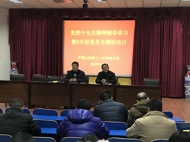 根据市教育局机关党委部署,1月17日下午,市十二中党支部在五楼演播厅开展了“党的十九大精神辅导讲习暨1月份党员主题活动日”活动。