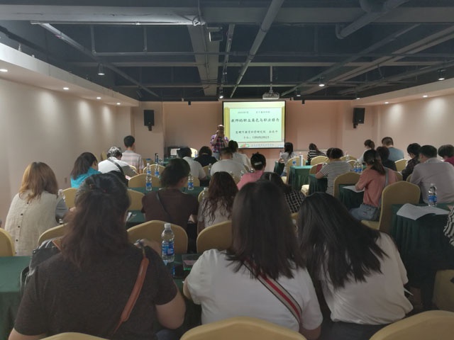 金教授为大家讲《中学教师的职业角色与职业修养》,教室里不时传来老师们会意的笑声。