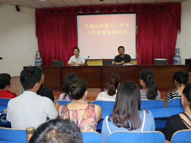8月24日下午市十二中召开七年级军训前的家长培训讲座。校长孙新志、副校长杨海涛参加了会议。