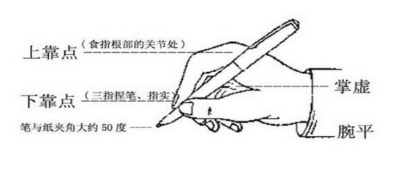 正确的执笔方法是:拇指、食指、中指分别用第一节从三个方向合力捏住笔杆下端,即拇指、食指从笔杆的前部左右夹住笔杆,食指稍前伸,而中指以指甲的上后侧抵住笔杆的后下方。距离笔尖约一寸左右,指尖低于拇指、食指。无名指和小指依次自然向手心弯曲,紧靠中指下方,对中指起运笔协调作用,不能接触纸面。笔杆上端斜靠在食指第三节的最高骨处,向右后方倾斜,和纸面早50度左右的角度。