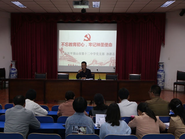 10月8日下午,市十二中党支部根据“不忘初心、牢记使命”主题教育计划安排在学校五楼演播厅召开全体党员会议,学校党支部书记孙新志以《不忘教育初心,牢记神圣使命》为题目,为全体党员讲党课。