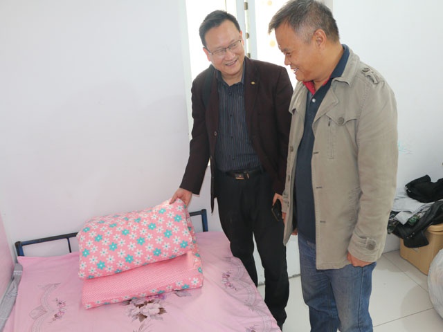 最后,市十二中领导看望在该校支教的两位教师。孙校长一行走进王振生老师和付延军老师的宿舍,了解支教老师的生活与工作情况,送上慰问品并仔细询问有何困难需要学校帮助解决。孙校长掀看支教老师的被褥,关心天气变凉后支教教师是否住的暖和。校领导的细心与关怀让两位支教教师倍感温暖,王老师和付老师纷纷表示将继续努力工作,高效、优质地完成支教任务,为梁洼教育事业做出贡献,也为十二中争光。