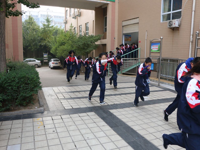 上午9:50随着警报响起,疏散演练正式开始,全校师生按照预定的疏散路线,快速、有序地撤离到操场(用时3分03秒),各班整队后由班干部清点汇报各班应到、实到人数,确认学生是否全部撤出教室。