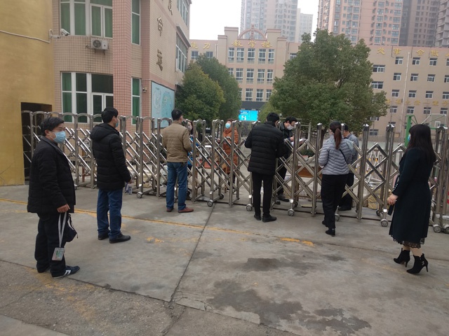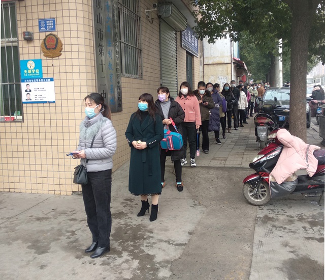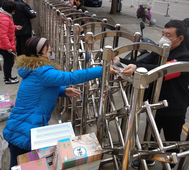 2月29日下午和3月1日全天,七、八、九年级的学生家长分别按预定时间段到学校门口领取教材。志愿者刘建兴、许凌菲、冯艳贞、闫国灿、刘三强、张春兰、朱国召、陈海勇等老师提前对校门口进行喷洒消毒并在校门口的东西两侧摆放两处桌凳和教材,按照预定分工,每处三名志愿者负责,一人负责记录(按名单划勾),一人配书发书,一人维持家长排队(家长在人行道上排队,每两人之间保持1.5米间距)。家长凭学生卡领取,领取教材之后快速离开,整个发放过程组织严密、井然有序,很好的避免了聚集,家长纷纷称赞:“这样领书,又快又安全,学校想的可真全面啊”。考虑到个别不能按时到场领取的家长,再单独约定时间,到校门口由值班人员转交并做好记录。