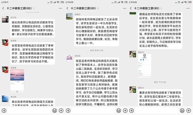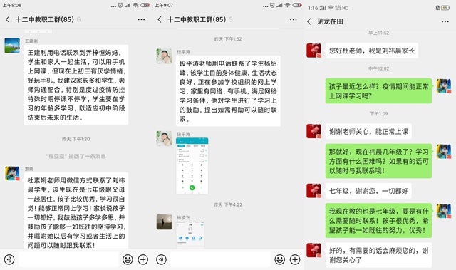在学生帮带方面。市十二中老师们通过微信、电话等形式,与学生进行沟通交流,了解他们目前生活状况,家人状况以及在线学习情况,分享学习中收获和快乐,了解生活和学习中存在什么困难。结合每个学生的情况予以帮助。如,程亚亚老师帮扶的李同学感觉在数学学习上有些吃力,程老师一方面鼓励他树立信心,多练多问,同时程亚亚老师通过多方挑选,找到一些适合这位学生的网上学习资料,第一时间发送给他,学生感谢程老师的关心和帮助。王建利老师帮扶的乔同学正就读九年级,学生思想有压力同时存在厌学焦虑等情情绪,王老师耐心与学生和家长沟通,安慰学生,鼓励学生调整心态积极应考,同时叮嘱家长多与孩子沟通疏导。还有许多老师都与帮扶学生进行学习方法的指导和学习资源分享,帮助他们解决疑难问题,市十二中老师们的及时联系、精准帮扶赢得了学生和家长的感谢。