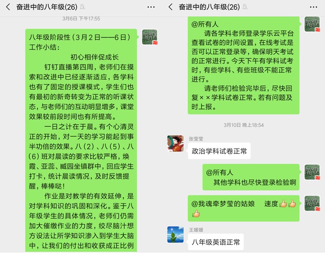 作为八年级部主任,许凌菲老师每天关心着年级的线上授课情况,关心学生的健康和学习情况。她经常给老师们发微信、打电话加油鼓劲,鼓励老师们以积极状态饱满的热情投入到教学工作中去,她把每周的各班上课、学生听课、师生辅导等情况写成一周小结,反馈到年级微信群里,带动大家继续坚定前行,促进了八年级的各项工作有条不紊的进行。