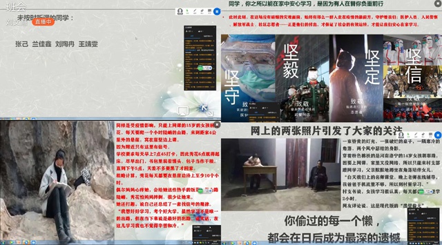 班级管理上,为了提高同学们网课的学习效率,她采取划分学习小组进行竞争的模式,进行组内监督和小组间竞争,以此调动同学们的学习积极性。每天在班级群反馈听课、提交作业情况,让家长能够了解孩子每天的学习。她仔细摸底排查学生的外出情况,学生每日健康以及流动状况,进行统计并且上报学校。为了统计数据的准确性,需要经常和家长一遍遍核实。刘老师经常通过微信群、钉钉群等形式向学生及家长宣传防控疫情的相关知识,对学生和家长进行心理疏导,引导大家安心居家学习,保持身心健康。