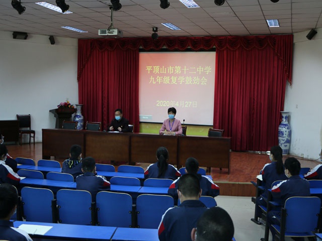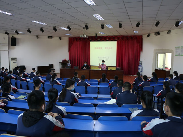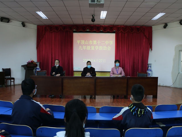 为尽快调整学生在疫情期间松散的学习状态,让他们尽快回归到紧张有序的校园生活中来,4月27和28日,市十二中分批组织九年级学生进行中招动员鼓劲,校长孙新志、副校长席明焕和九年级部分教师参加了大会,会议由教务处刘建兴主任主持。