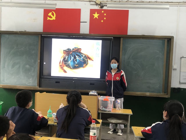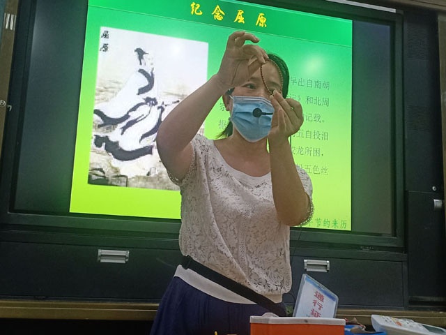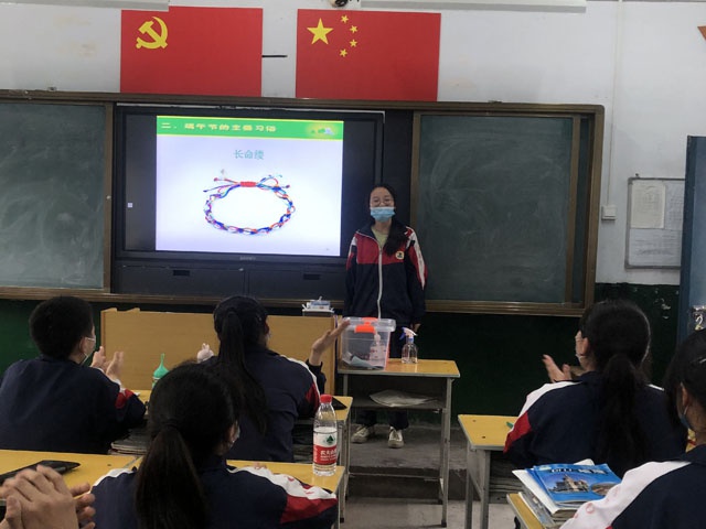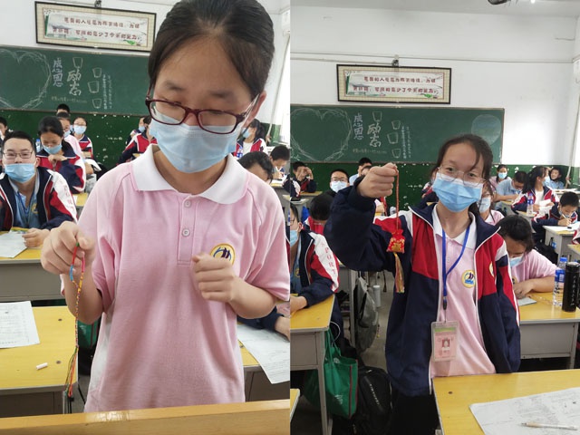 八(4)班刘梦柯、张冰倩、高奇然讲述了香包的、长命缕、艾条等不同地区传统端午文化习俗;八(6)班李琳和贺梦真同学展示了具有本地特色的“香囊”和“五彩绳”,香囊和五彩绳是传统端午节饰品,有驱虫驱蚊的功效,寓意长辈的庇护之意;班主任杜素娟老师演示了“五彩绳”的制作方法。同学们用不同的方式展现家乡的端午习俗。