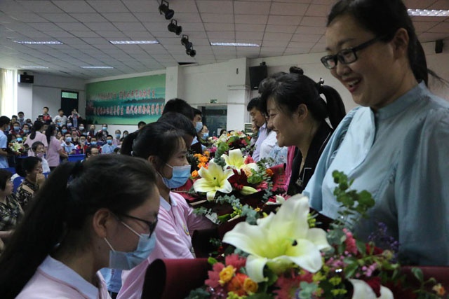 最后,学生代表向亲爱的老师们献花。一束束鲜花带着学生对老师们的感激和依恋,一份份礼物带着同学对老师们的情感,掌声和献花都献给学生们心中最可爱的人。