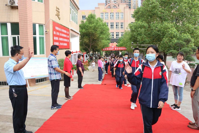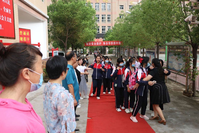 毕业不是再见,是新的相遇。怀着依依不舍的心情,孙新志校长带领九年级全体教师欢送学生,学生们整齐排队踏上红地毯,走向新目标。师生们一次次紧紧的拥抱,一个个含泪的微笑,记忆这一美好的时刻。