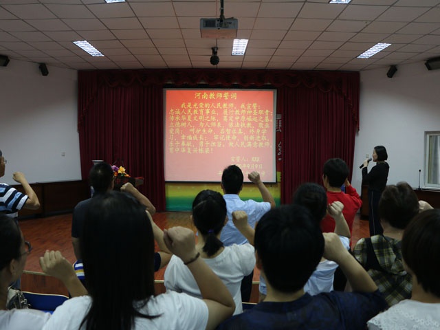 大会在雄壮的国歌声中拉开序幕,紧接着全体教师庄严肃立,高举右拳重温河南省教师誓词,阵阵发自肺腑的誓词,表明了全体教职工砥砺师德,承载使命,坚定信念、勇于担当的决心。