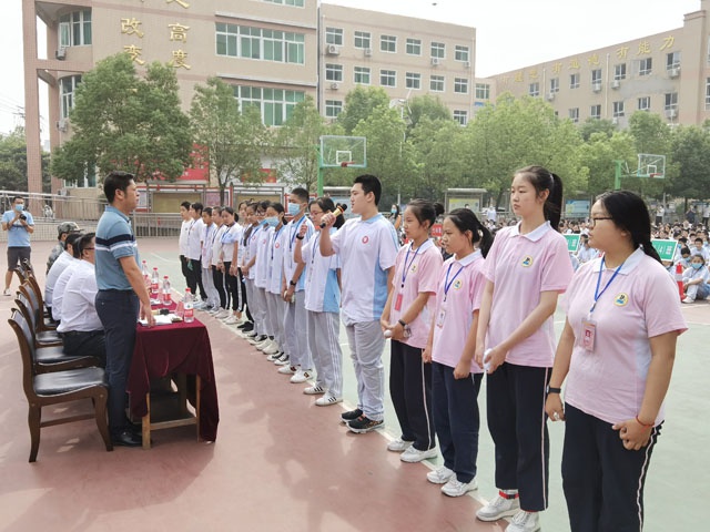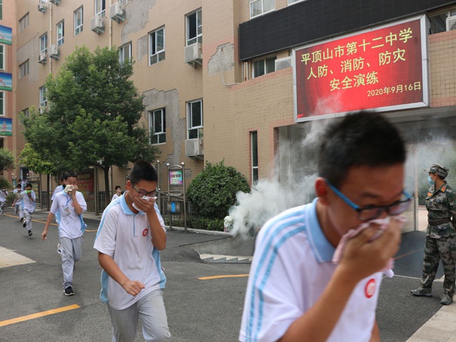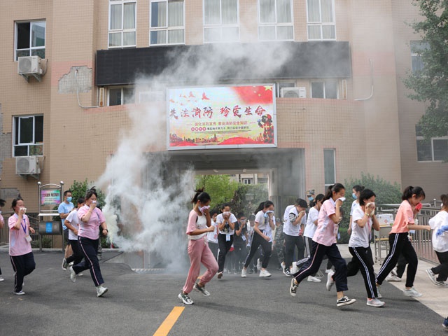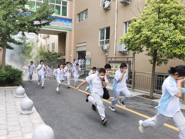 上午9点50分警报响起,班主任、任课教师组织全体学生在杨海涛副校长的指挥下,迅速进入紧急疏散状态:在张晗主任的统一指挥下、在老师们的带领下,学生用湿毛巾、衣服等捂住口鼻有序撤出教室;按消防标示确定疏散的方向、逃生演练方案设定的逃生路线,迅速而有序地从教学楼撤离到操场。