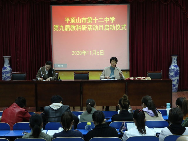 11月6日,平顶山市第十二中学在五楼演播厅隆重举行了第九届“教科研活动月”启动仪式,教科室副主任巩淼焱主持会议。