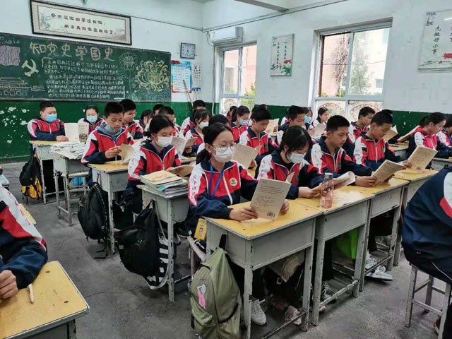4月23日下午,各班活动正式开始,学生们或携带自己喜爱的书籍,或到图书馆借阅书籍,大家相约一起静心阅读红色经典书籍。在分享环节,七四班班主任鲁卓娅分享自己的读书心得:走进那激情燃烧的岁月里,重温那段历史的过程,我深刻地感受到了革命先烈们抛头颅、洒热血,为中国的和平解放不惜牺牲一切的抗战精神;七六班学生张瀚博分享自己的读书心得:作为和平年代的初中生,不能忘记那段腥风血雨的岁月,应该永远缅怀革命先辈。各班同学们争先恐后分享红色故事,共同感受故事带来的革命精神。