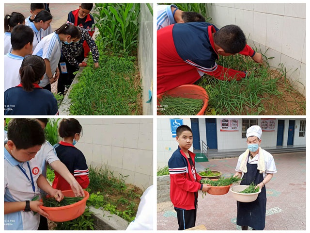 采摘蔬菜现场,师生热情无比高昂,同学们一边听李慧老师们讲解割韭菜的方法,一边模仿实验,一会时间就收割完了玉米菜、云江菜、韭菜。学生们亲手将劳动成果交到了学校食堂师傅手里,为校食堂提供优质食材。接着,老师和学生们为劳动实践区的花卉、蔬菜等绿植除草,施肥,浇水,大家干得热火朝天,不亦乐乎。