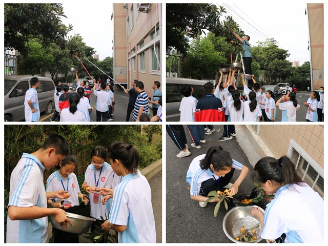 在枇杷果树下,同学们在老师监护下,爬上梯子,开心地采摘黄澄澄的枇杷果,欢声笑语充满采摘现场。采摘后,同学们把收获的枇杷果带到班里,让同学们共同品尝劳动的果实。