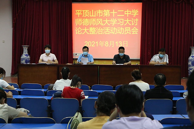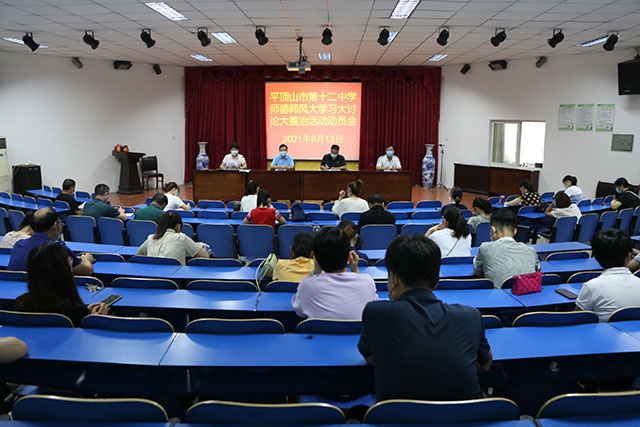 8月13日下午,平顶山市第十二中学在五楼演播厅组织召开师德师风大学习大讨论大整治活动动员大会,校长孙新志和校领导班子成员、全体教职工参会。