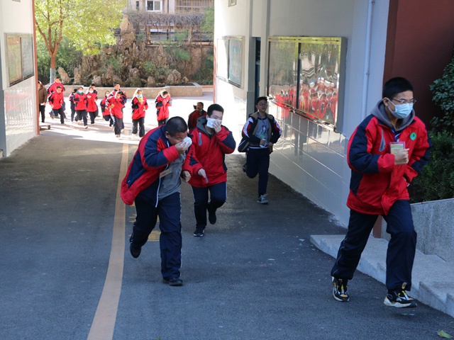上午9时50分,消防安全疏散演练正式开始,随着警报的响起,各楼层负责人员提前到达指定岗位,指导所在楼层学生快速撤离“火灾现场”;各班班主任维持秩序,学生弯着腰,将身体放低,用打湿的毛巾等捂住口鼻,沿着指定逃生路线快速有序地撤离到安全区域;随即各班主任清点人数,向现场总指挥汇报。演练共用时2分28秒,900余名师生全部安全疏散完毕,整个过程紧张有序,实用性强,达到了预期效果。