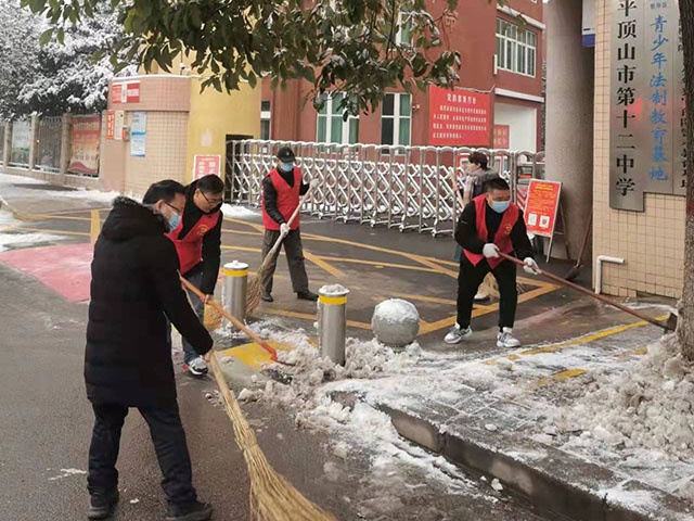 1月24日上午,凛冽的寒风中,市十二中的部分党员教师在孙新志校长的带领下,踏着积雪,不畏严寒,挥舞铁锹,有的铲、有的扫、有的推,忙得不亦乐乎。低温中,雪花和冰水浸湿了衣裳,但老师们扫雪的热情没有被阻挡,很快就为校园周边居民开辟出一条条洋溢着温情的畅通之路。