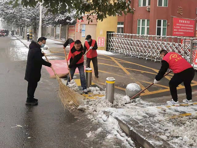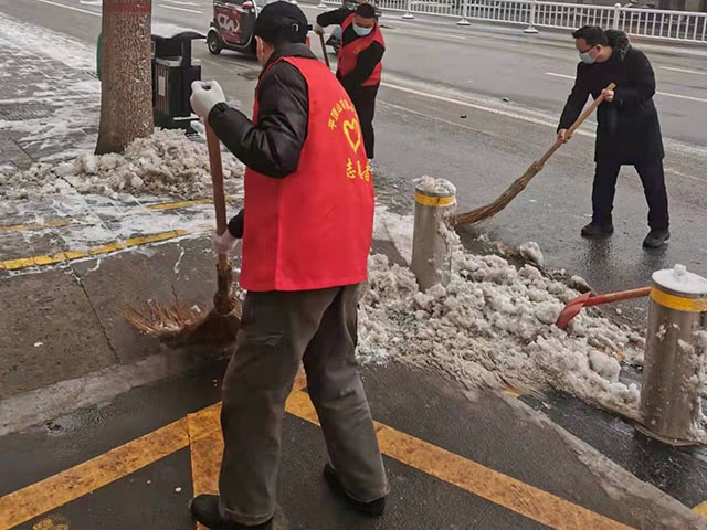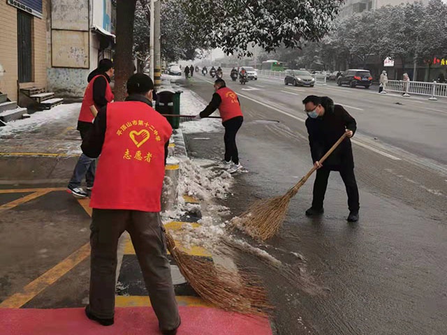 隆冬时节,雪花飞扬。市十二中的志愿者们在坚守防疫的同时,积极开展扫雪志愿服务活动,确保了学校附近群众平安出行。