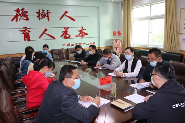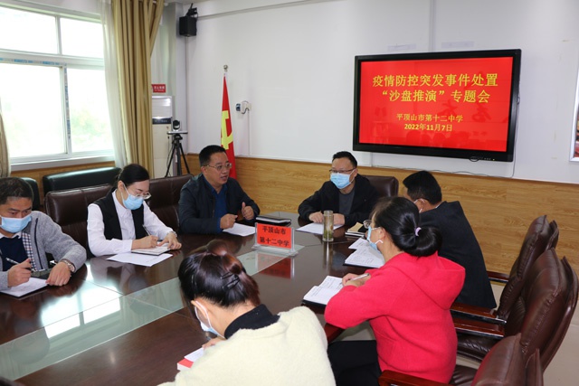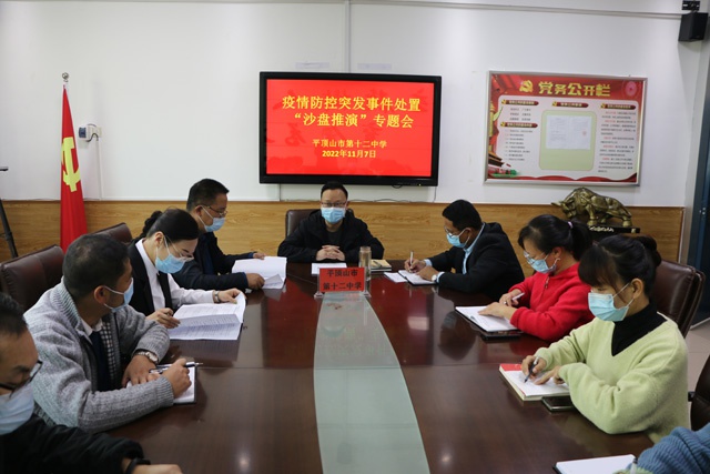 2022年11月7日上午9时,平顶山市第十二中学在三楼会议室召开突发事件处置“沙盘推演”专题会议,会议由副校长杨海涛主持,校长孙新志、副校长郭军、全体中层参加。