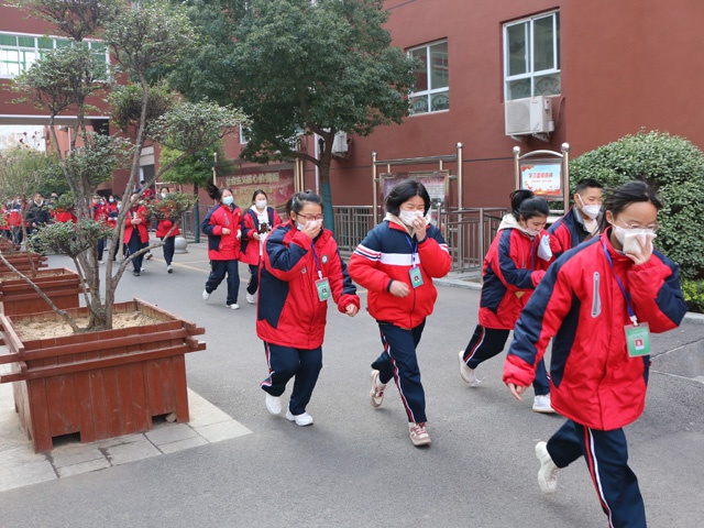 2月28日9点45分,各楼层引导员、班主任老师等人员提前到达指定岗位。总指挥宣布消防安全疏散演练开始。一阵急促的警报声响起,班主任、科任老师带领学生用手捂住口鼻,弯着腰、猫着步,沿着指定的疏散路线快速、有序地撤离到学校操场的指定位置。