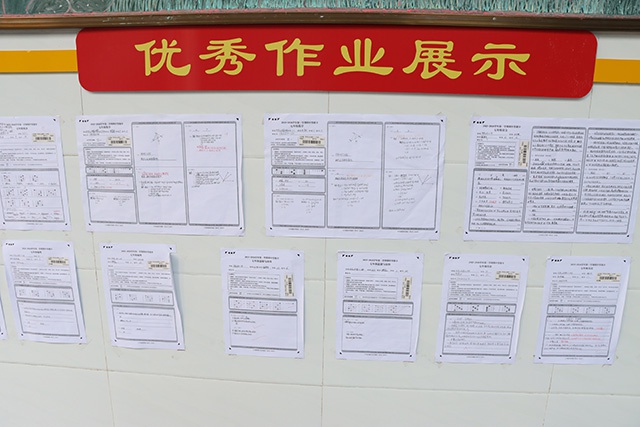 展示墙清晰划分两大核心板块,内容丰富而富有特色。在 “优秀才艺展示” 板块,整齐陈列的硬笔书法作品尤为亮眼,内容涵盖经典诗词片段,笔锋遒劲工整、布局疏密匀称,尽显同学们扎实的文字功底;英文书写作品字迹娟秀流畅,搭配创意十足的边框设计,既展现了英语学科素养,更彰显了同学们的巧思妙想。另一板块 “优秀作业展示” 中,各科优秀作业字迹工整、细节完善,直观呈现了七年级学子严谨认真的学习态度与良好的学习习惯。