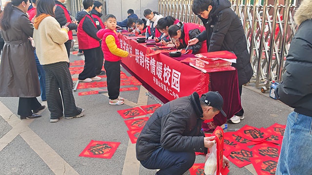 书写间隙,校党总支书记范登河、校长李海涛带领学校领导班子,手持书写的祝福春联,向在场师生、家长及社区居民致以诚挚的新春祝福,传递浓浓温情与美好期盼,现场气氛喜庆热烈、暖意融融。大家将写好的春联与福字细心晾干、精心整理,带着满满的新春祝福满载而归。