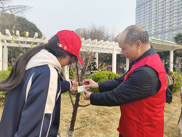 随后,师生志愿者们分组协作、有序行动,细致开展树木挂牌、浇水养护等工作。大家小心翼翼地为每棵树木挂上认养牌,提着水桶穿梭于林间,为抽芽的树苗浇上饱含希望的清水,仔细清理树坑周边的杂草与杂物,用细致的行动呵护着每一片绿意、每一朵含苞的花蕾。