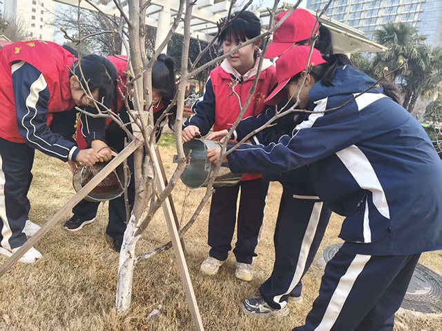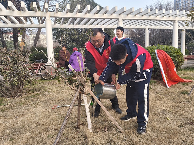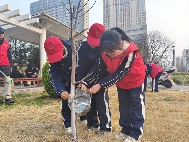 劳动现场,师生志愿者们热情高涨、配合默契。李海涛、郭鹏飞带头为树木浇水养护,叮嘱大家珍惜劳动成果,自觉养成爱绿护绿的良好习惯。党员教师志愿者率先垂范,细心指导学生开展实践;学生志愿者认真专注、用心呵护,在劳动中增强了生态环保意识。