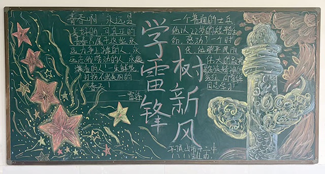 学校借助国旗下讲话仪式,以 “学雷锋我行动” 为主题,向全体同学发出倡议,号召大家将雷锋精神融入日常学习与生活,用实际行动传承美德。各班积极开展 “传承雷锋精神,书写青春担当” 主题班会,通过讲述雷锋事迹、诵读雷锋日记、分享感悟体会等形式,引导同学们深入理解雷锋精神。同时,各班精心制作主题黑板报,以鲜明的主题、丰富的内容、新颖的设计,全面展现雷锋精神内涵,营造出浓厚的学雷锋氛围。