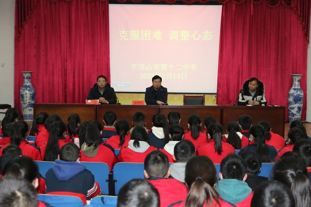 2月14日,市十二中举行“克服困难,调整心态” 八年级学生考后学习指导活动。校长范登河、副校长郭军,八年级部主任付延军以及全体八年级班主任参加,会议由付延军主持。